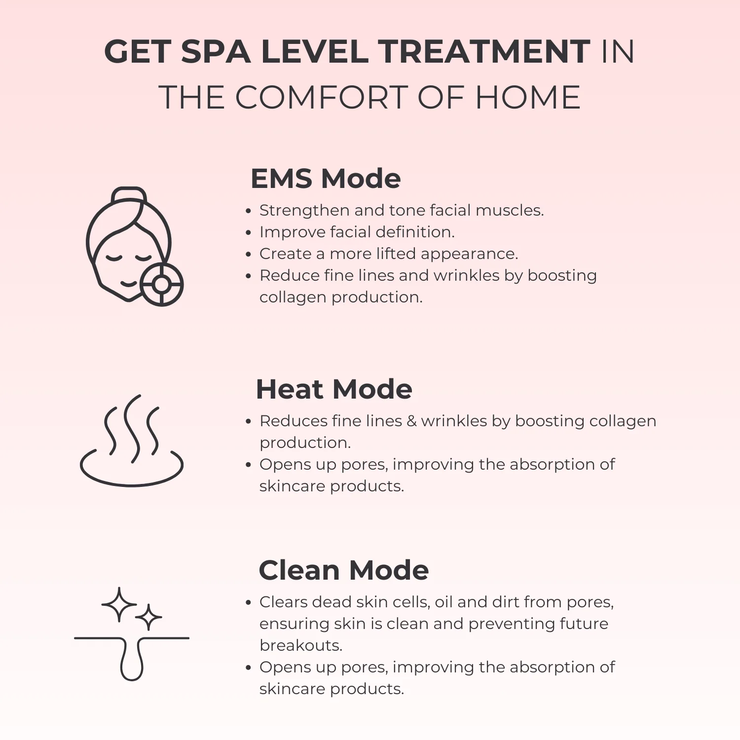 Three different modes come with our device including the Clean Mode, which helps to keep your skin fresh and unclog pores, EMS Mode, which delivers low-level electrical currents to tone and firm your face, and Heat Mode to further promote collagen production and enhance skin elasticity.
